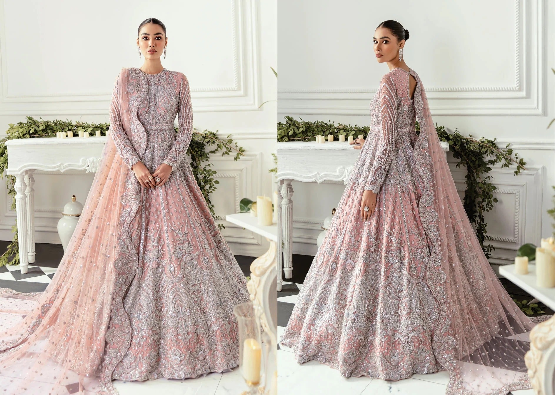 Step into the world of luxury with our Blush Pink Bridal Gown, a masterpiece from Anam Fatima Apparels Latest Bridal Collection. This stunning gown is adorned with intricate silver embellishments, showcasing the finest craftsmanship and attention to detail.