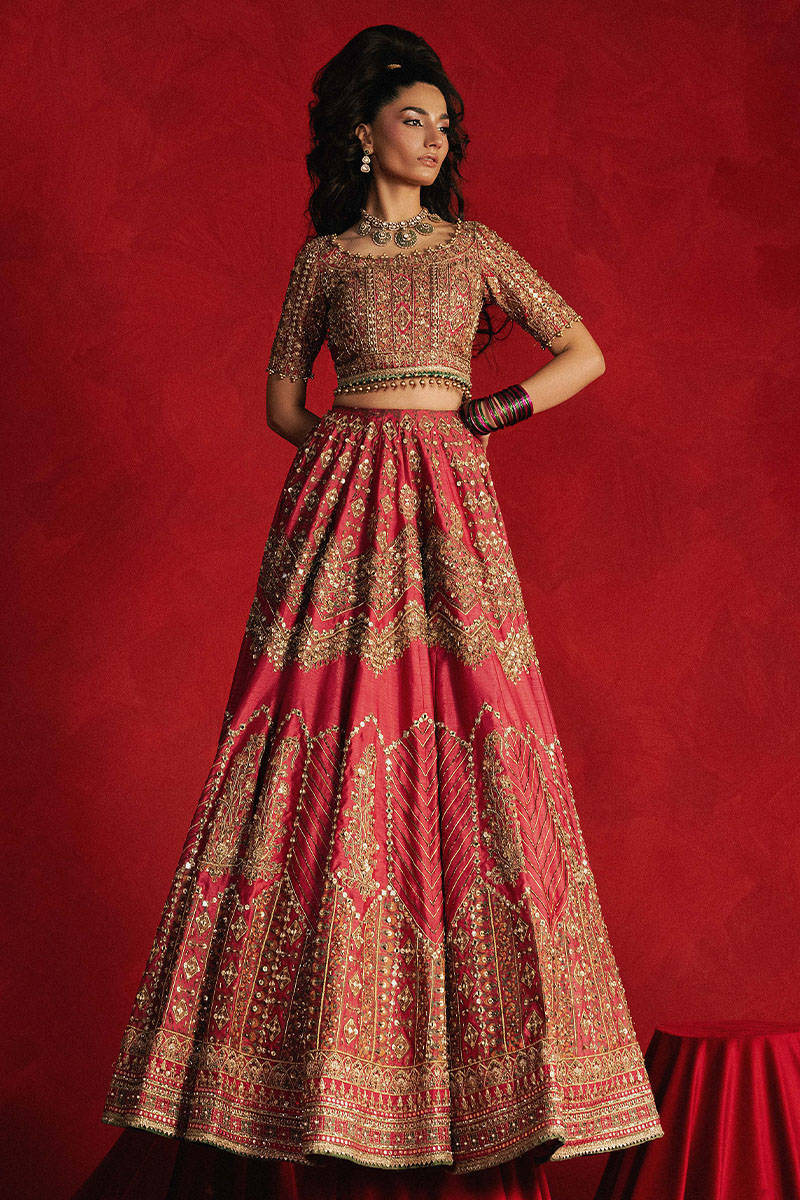 A vision of timeless romance, Gul Badan is crafted from rose pink Indian silk, evoking the charm of a bygone era. The short choli with modest half sleeves is delicately adorned with mirror work and subtle metallic thread embroidery. The lehenga unfolds from the waist in a graceful chevron pattern, transitioning into diamond-shaped panels—each featuring exquisite Mughal floral motifs rendered through silken thread embroidery, block printing, and shimmering mirror accents that sparkle like morning dew. Beneath this garden of geometry, vertical scrolls bloom like climbing vines, intricately embroidered in designs reminiscent of antique architecture. The hemline is enriched with layered embroidered borders, reminiscent of vintage sari pallus. Completing the ensemble, a contrasting lush green organza dupatta bursts with grand Mughal floral motifs in gota and adda work, elegantly framed with opulent gold borders and detailed trims on all four sides.