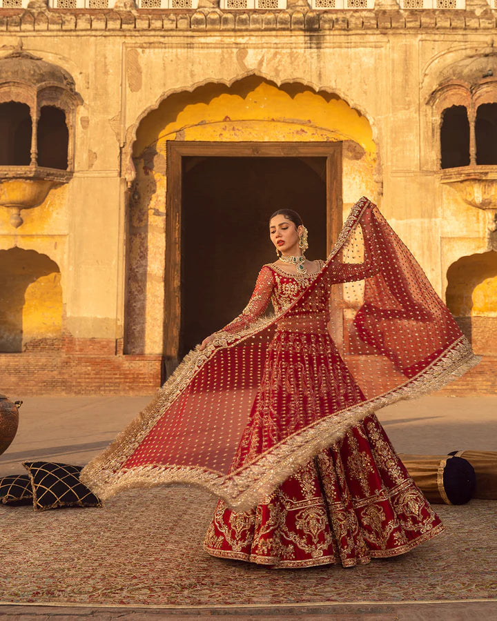 Crafted on a rich red canvas of fine-spun raw silk, Arusa embodies timeless luxury and regal charm. The lustrous lehenga set is exquisitely adorned with floral bouquets nestled within intricately designed arches, inspired by iconic Mughal inlay artistry. Each motif and pattern, from brimming floral vases to ornamental details, is brought to life by master artisans using hand techniques such as zardozi, kora, and dabka. Paired with a delicately hand-crafted dupatta, Arusa stands as a symphony of grace, tradition, and opulence.