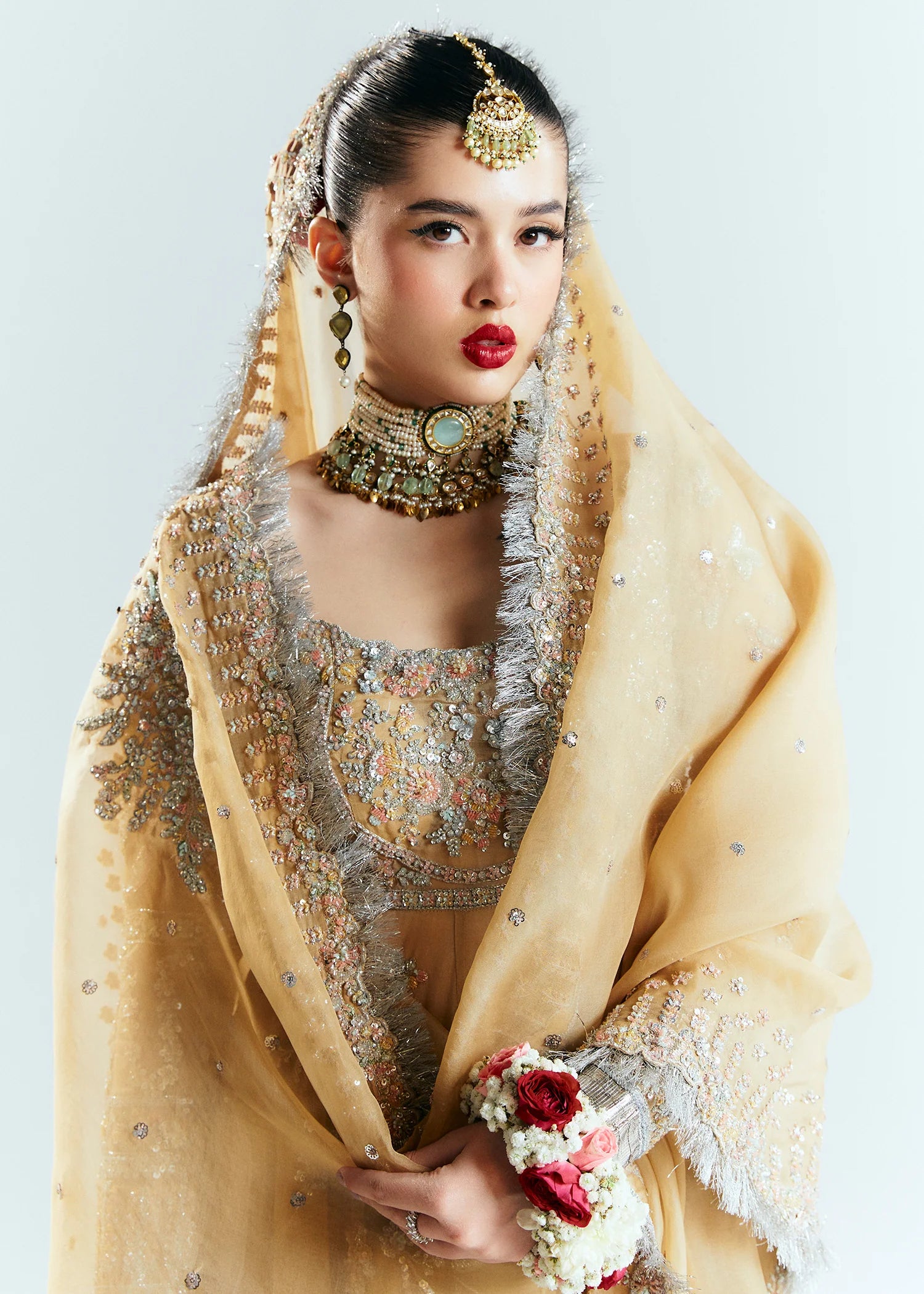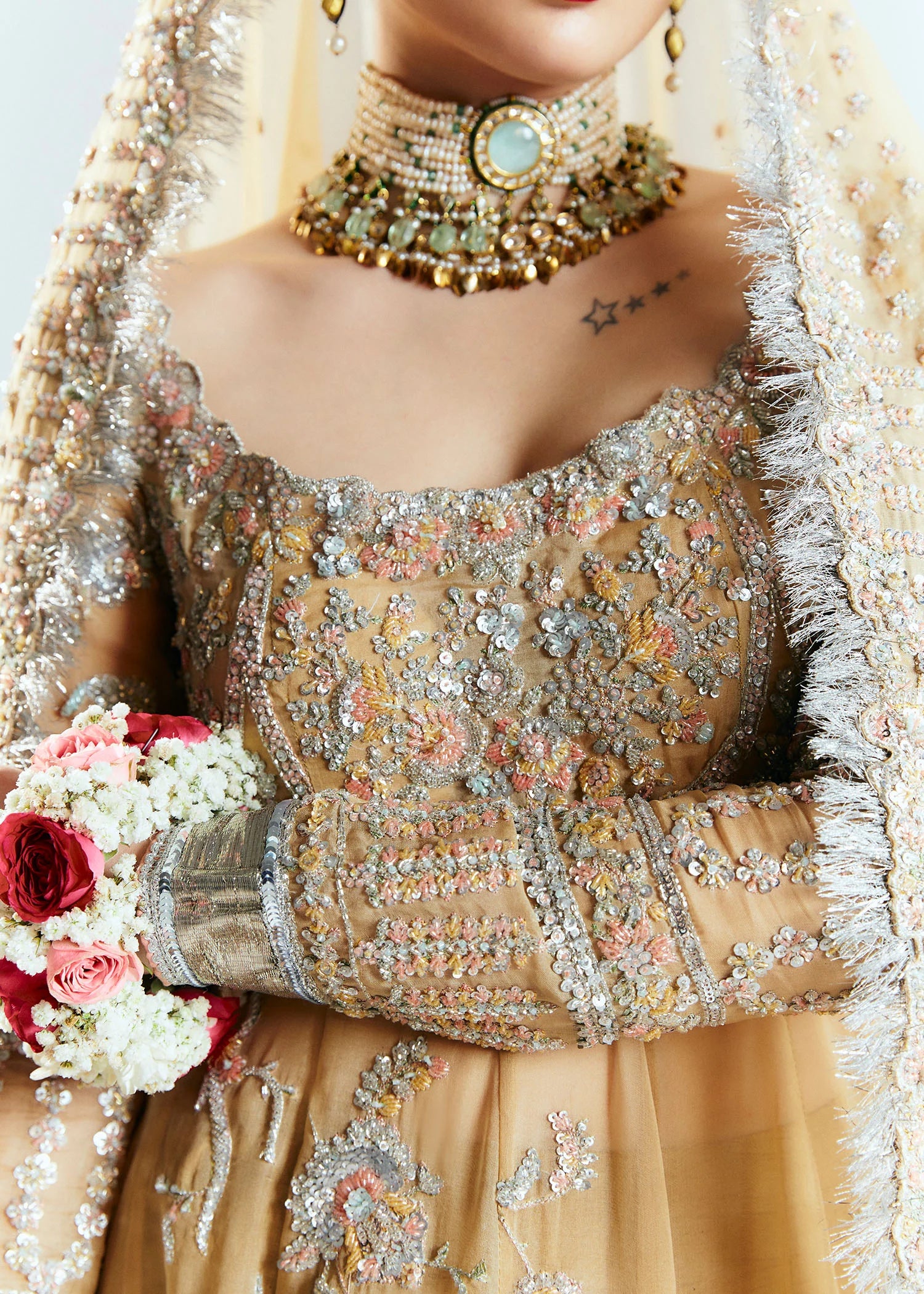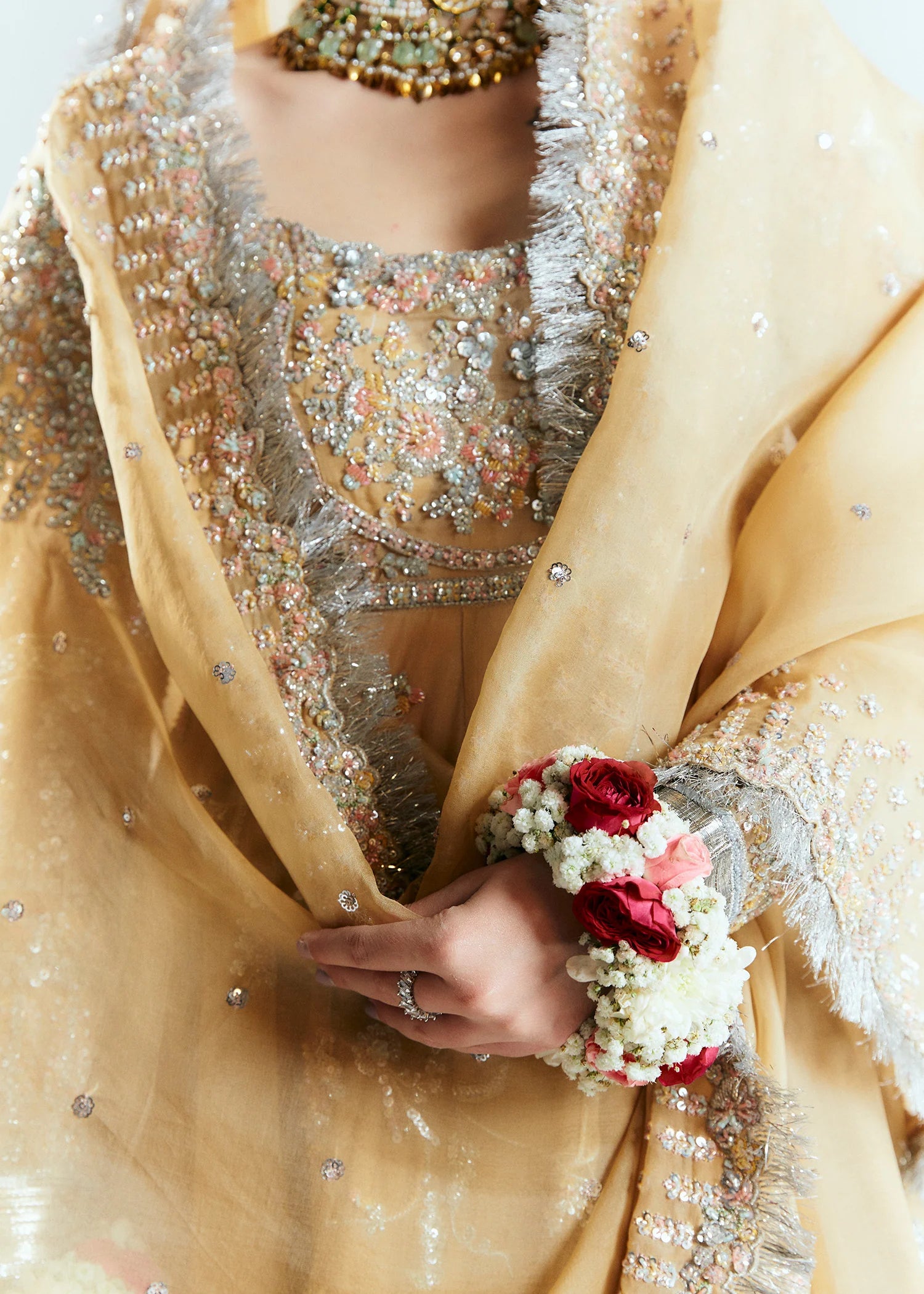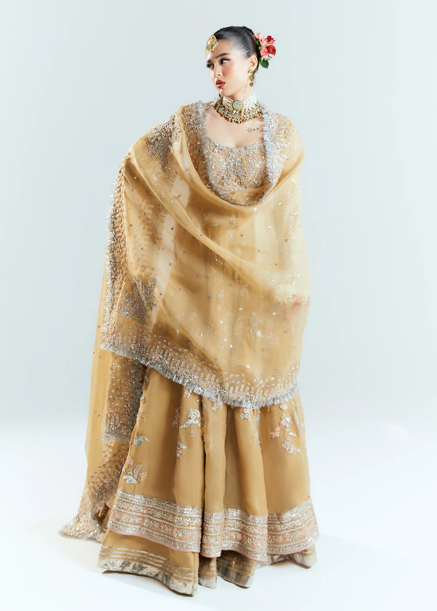 A symphony of artistry and opulence woven into every thread. Hand embellished bodice meets shimmering floral flare delicately embellished. The simple korean raw-silk sharara sways with grace and adds the volume to the attire, while the exquisite dupatta, trimmed with kiran on four sides completes this masterpiece of regal splendour.