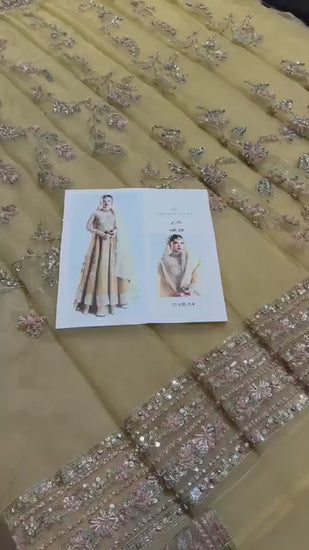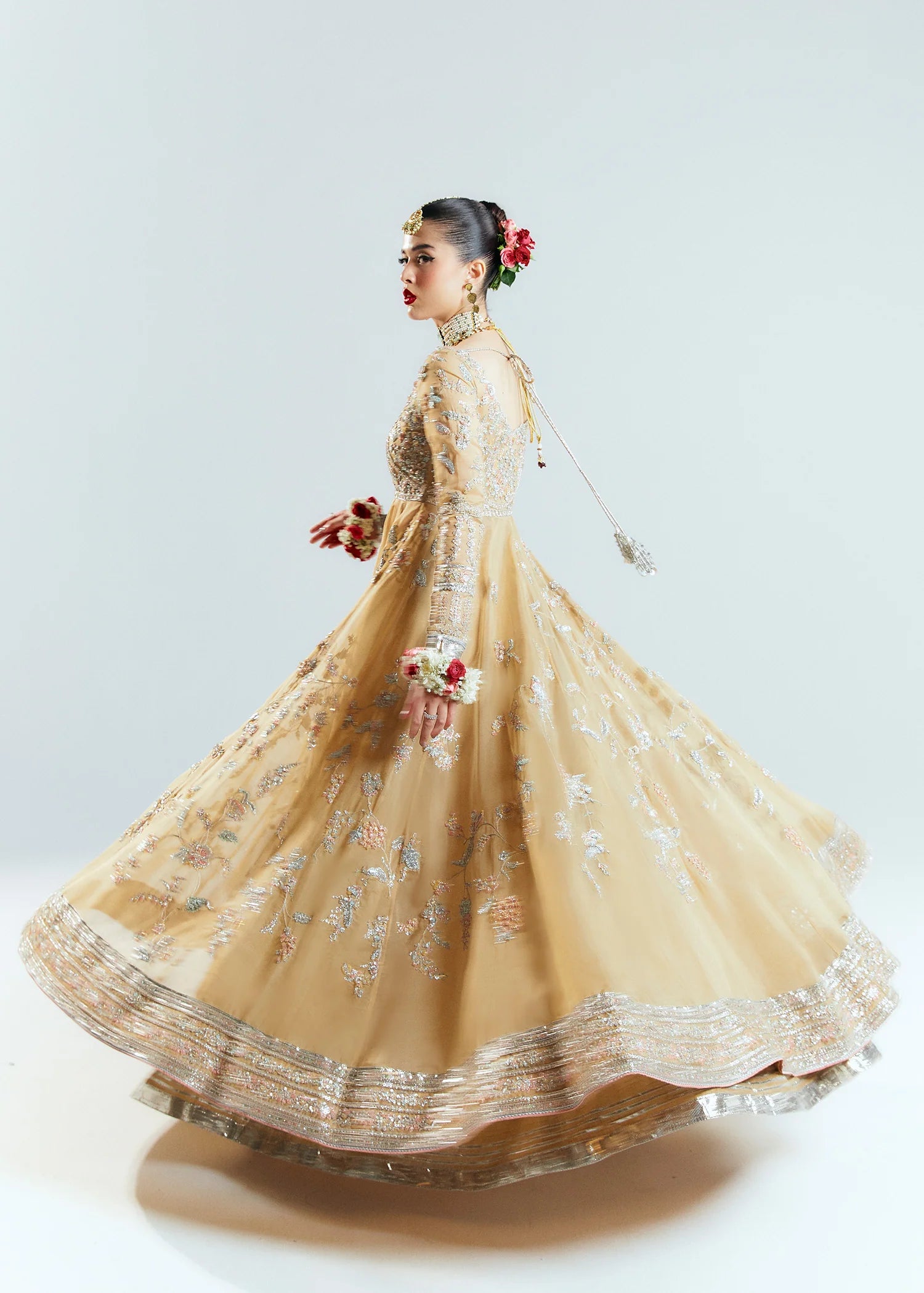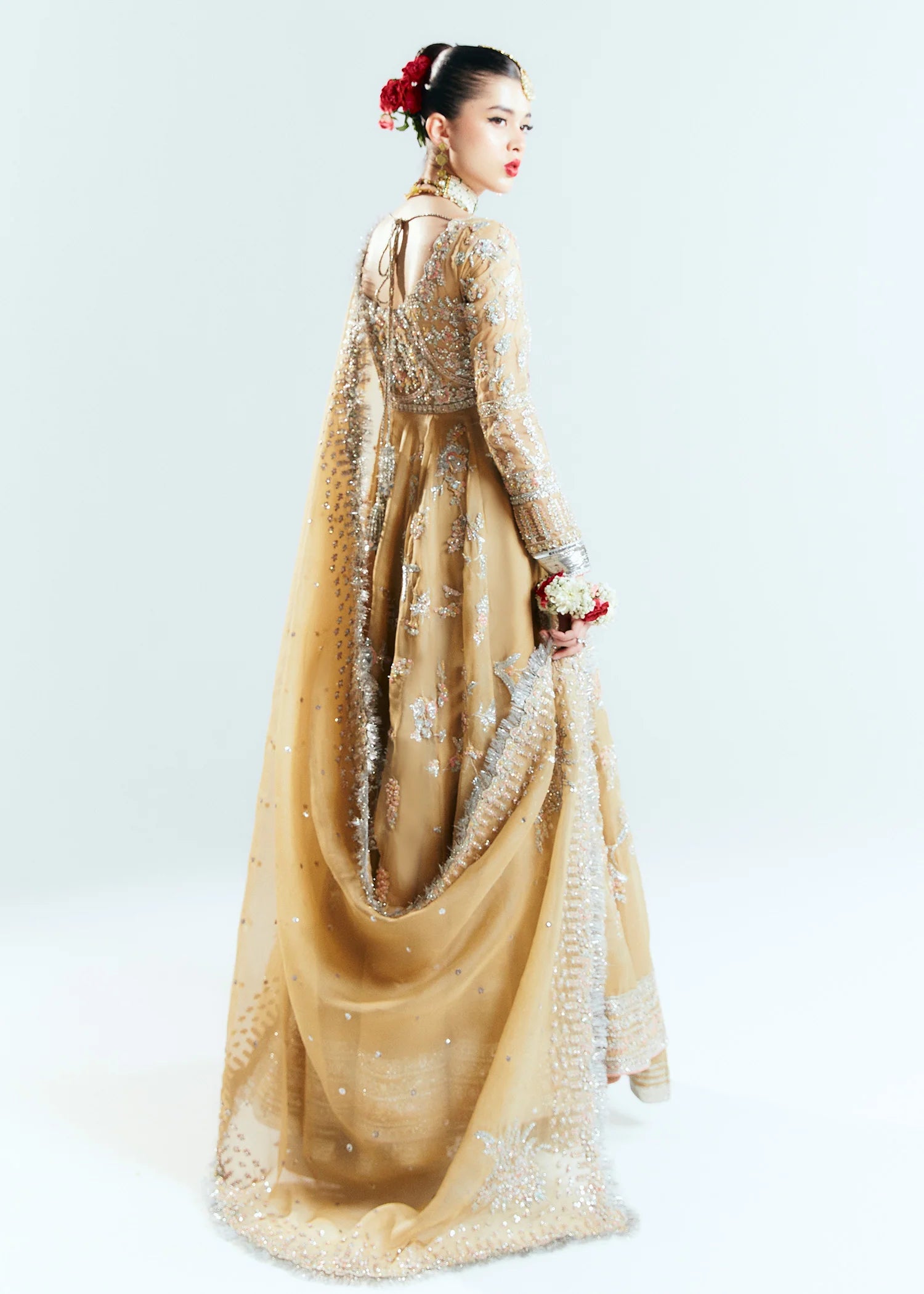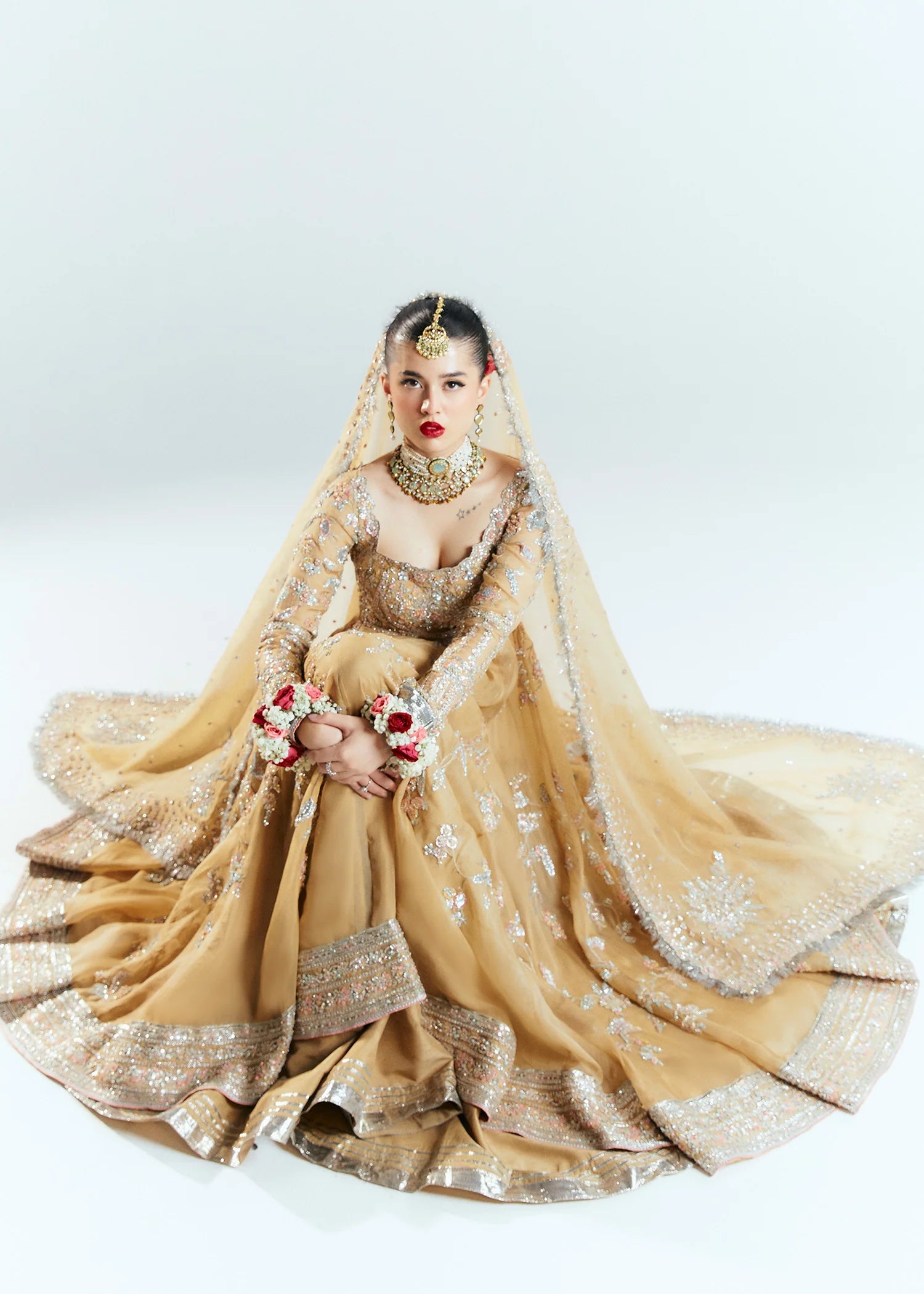 A symphony of artistry and opulence woven into every thread. Hand embellished bodice meets shimmering floral flare delicately embellished. The simple korean raw-silk sharara sways with grace and adds the volume to the attire, while the exquisite dupatta, trimmed with kiran on four sides completes this masterpiece of regal splendour.