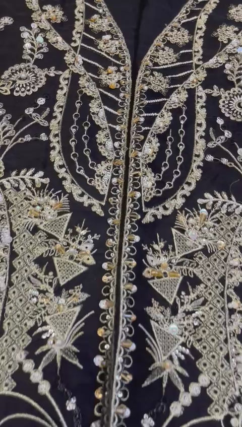 Command attention in this majestic onyx noir ensemble, a celebration of timeless elegance with a dramatic edge. The outfit features hand-embellished organza panels with scalloped detailing, elevated by intricate embroidery and refined borders that exude luxury. An intricately worked dupatta adds grace and sophistication, while the tailored trouser and inner ensure a sleek, refined finish. The design is further accentuated with a delicate silver sequin spray and masterful adda work, creating a luminous statement perfect for evening festivities.