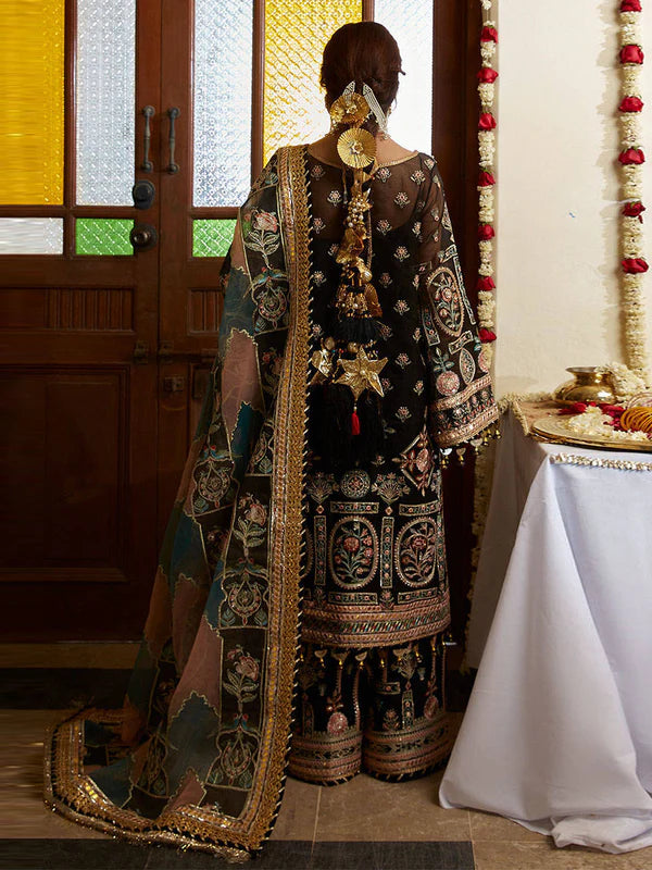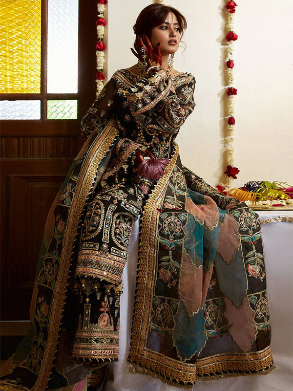 Sajal wears Basgul, a stunning soot colored ensemble featuring cascading floral vines and motifs composed between carefully placed arches.