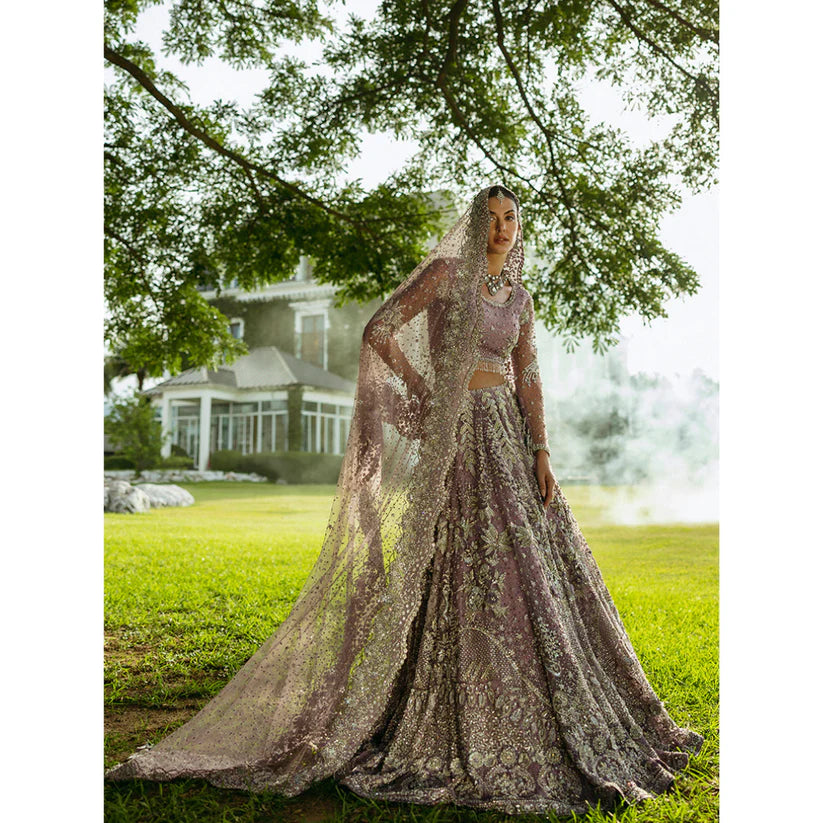 A breathtaking purple lehenga choli, exquisitely adorned with intricate dabka, naqshi, pearls, and Swarovski crystals, radiates opulence fit for a modern bride. The net lehenga is delicately embellished with a fine spray of threadwork and sequins, casting a soft, ethereal shimmer with every step. A true celebration of craftsmanship and elegance, this ensemble captures the essence of timeless bridal grandeur.