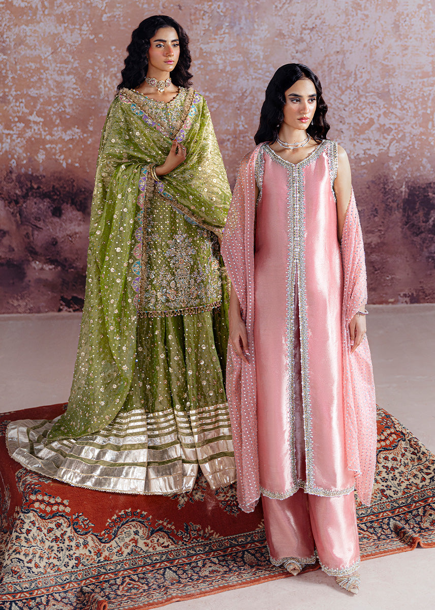 Ayda is a luminous fusion of heritage and modern elegance. Crafted from gleaming tissue, the silhouette features a graceful front-open design adorned with intricate hand embellishments that trace the sides and armholes, adding sculpted precision to its fluid form. The sheer tissue dupatta floats effortlessly, dusted with crystal accents that shimmer like stardust fading into a soft horizon. Completing the look, wide flared tissue pants cascade into a delicately refined border — their subtle sheen adding poise and structure to the ensemble’s ethereal charm.