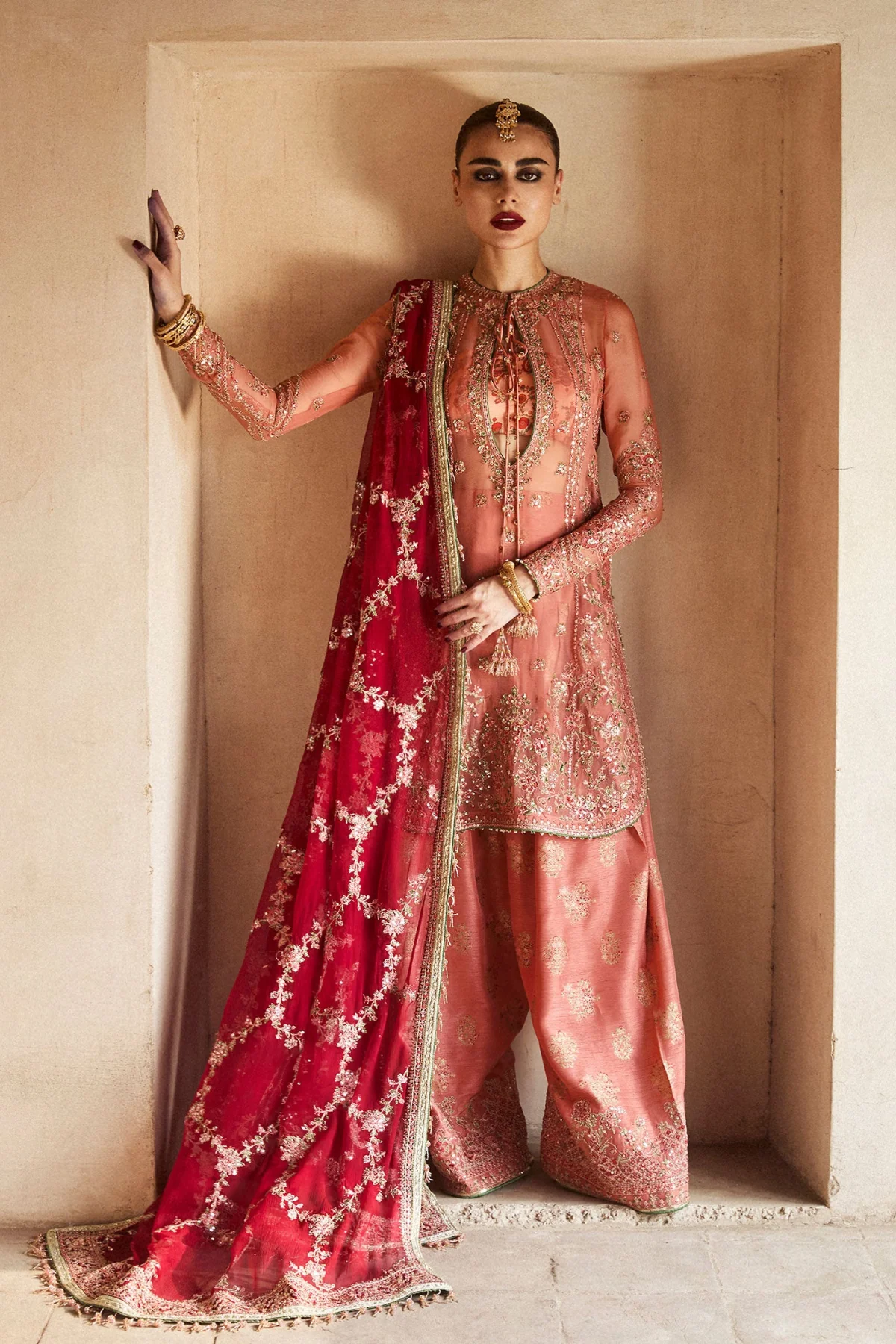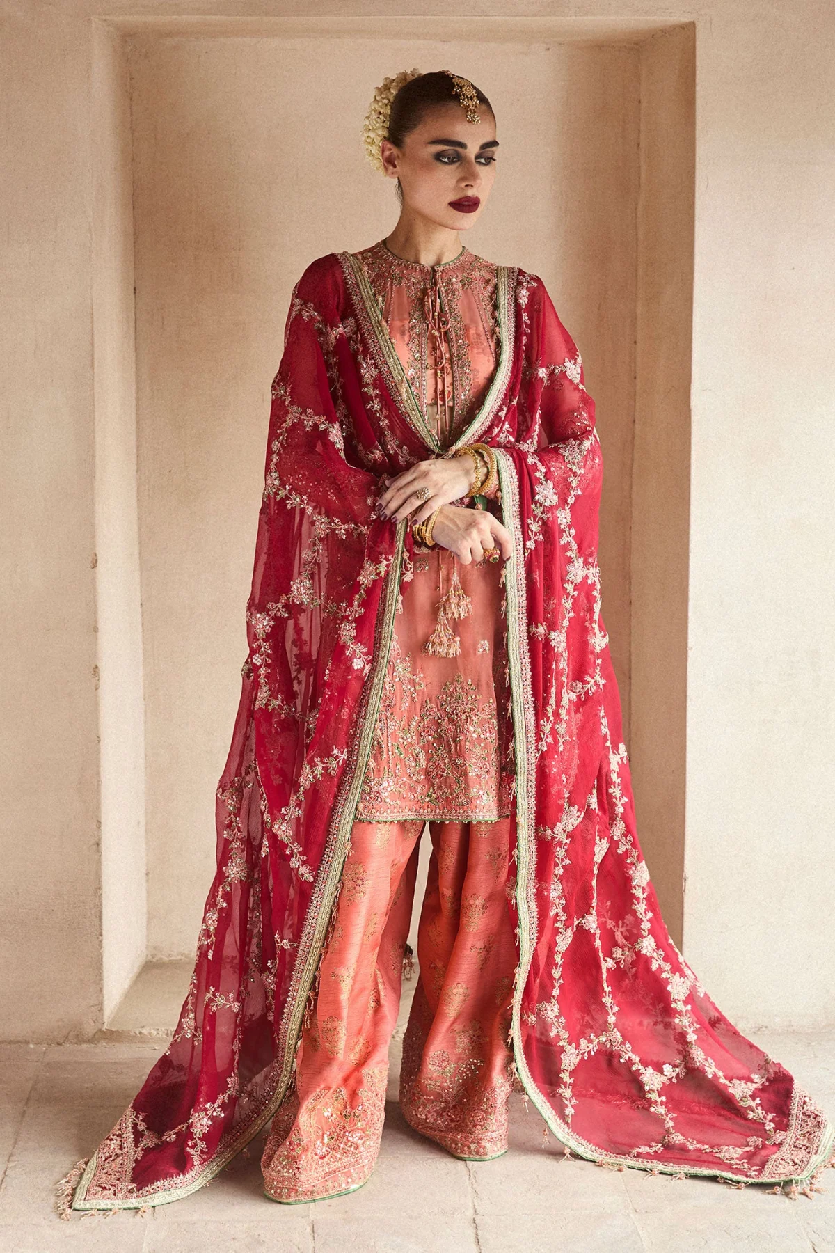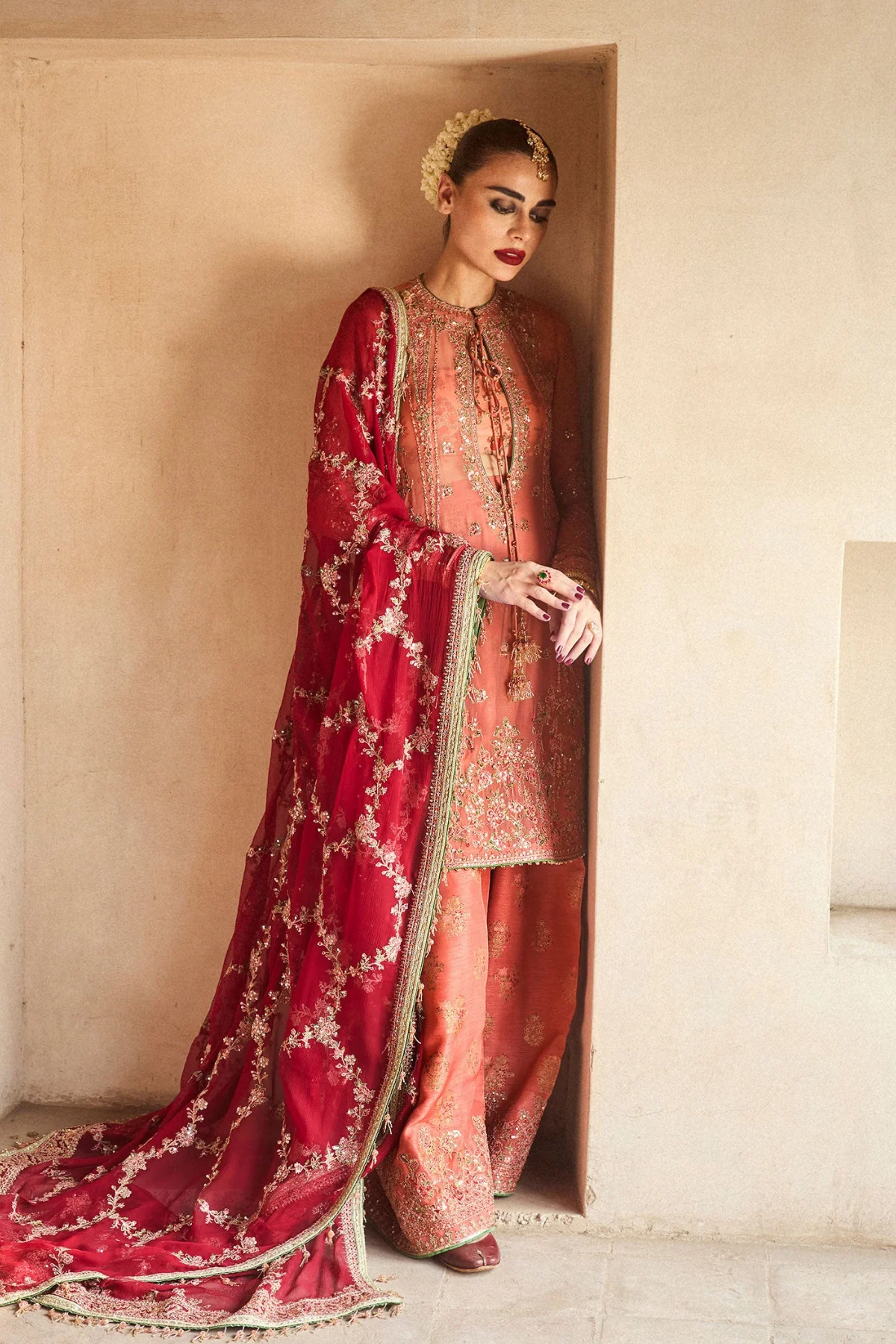 An embroidered chiffon dupatta, adorned with a delicate jaal pattern and finished with ornate four-sided borders, completes the look with refined elegance. A flawless harmony of tradition and modern sophistication, this ensemble is destined to leave a lasting impression.