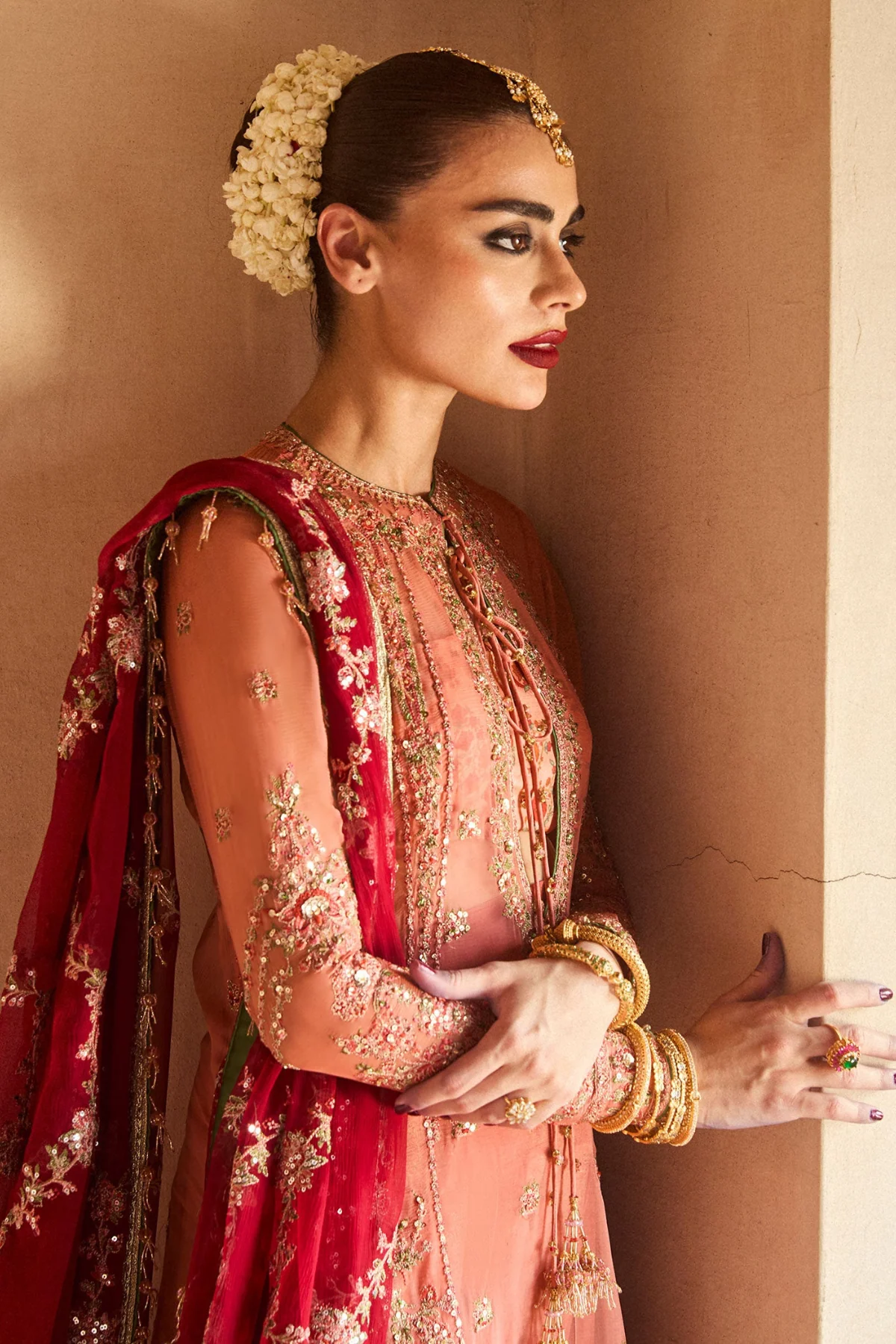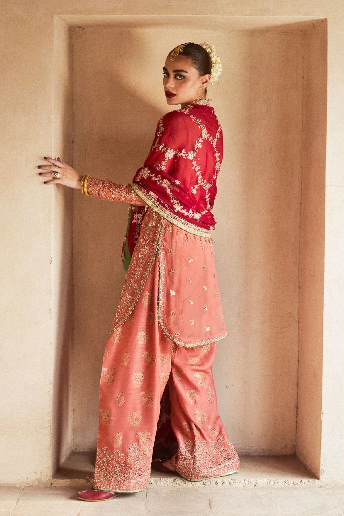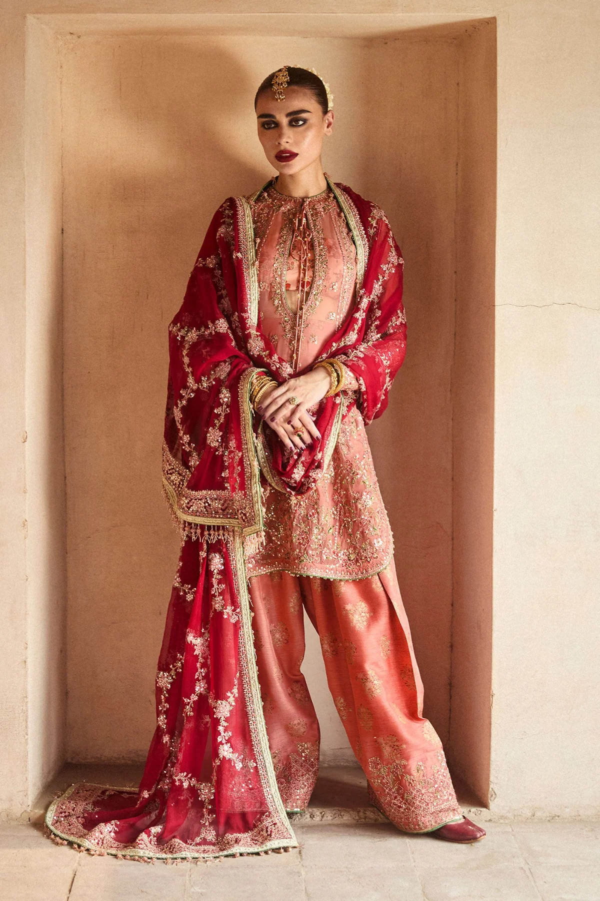 An embroidered chiffon dupatta, adorned with a delicate jaal pattern and finished with ornate four-sided borders, completes the look with refined elegance. A flawless harmony of tradition and modern sophistication, this ensemble is destined to leave a lasting impression.