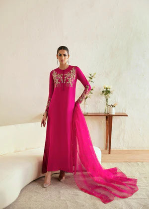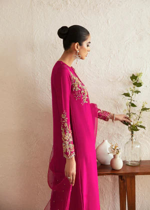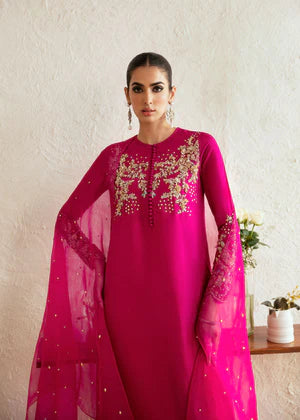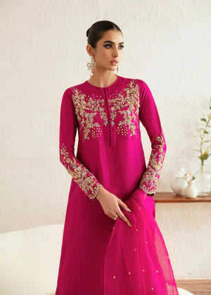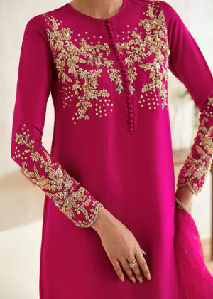 Prepare to captivate in our Shocking Pink Ensemble! A straight, long shirt crafted from luxurious pure raw silk boasts a modern allure with full hand embellishments, promising to dazzle with every step. Paired seamlessly with cigarette pants for a chic silhouette, and adorned with an embellished organza dupatta, this ensemble exudes sophistication and style. Immerse yourself in the bold elegance of our captivating creation, designed to command attention and leave a lasting impression.