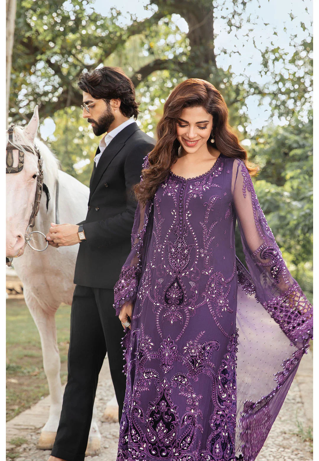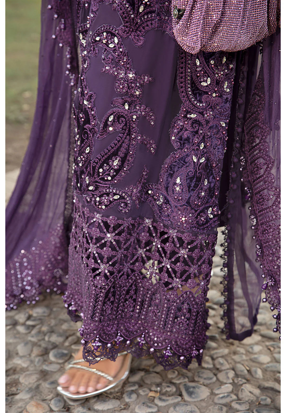 Embrace timeless sophistication in this regal purple formal ensemble. Adorned with intricate embroidery and delicate hand embellishments, the design exudes refined elegance. The luxurious fabric cascades gracefully, while the deep purple hue adds a royal charm. Paired with a flowing dupatta that enhances its artistry, this outfit is a perfect choice for weddings, formal soirées, or evening celebrations—crafted to leave an unforgettable impression.