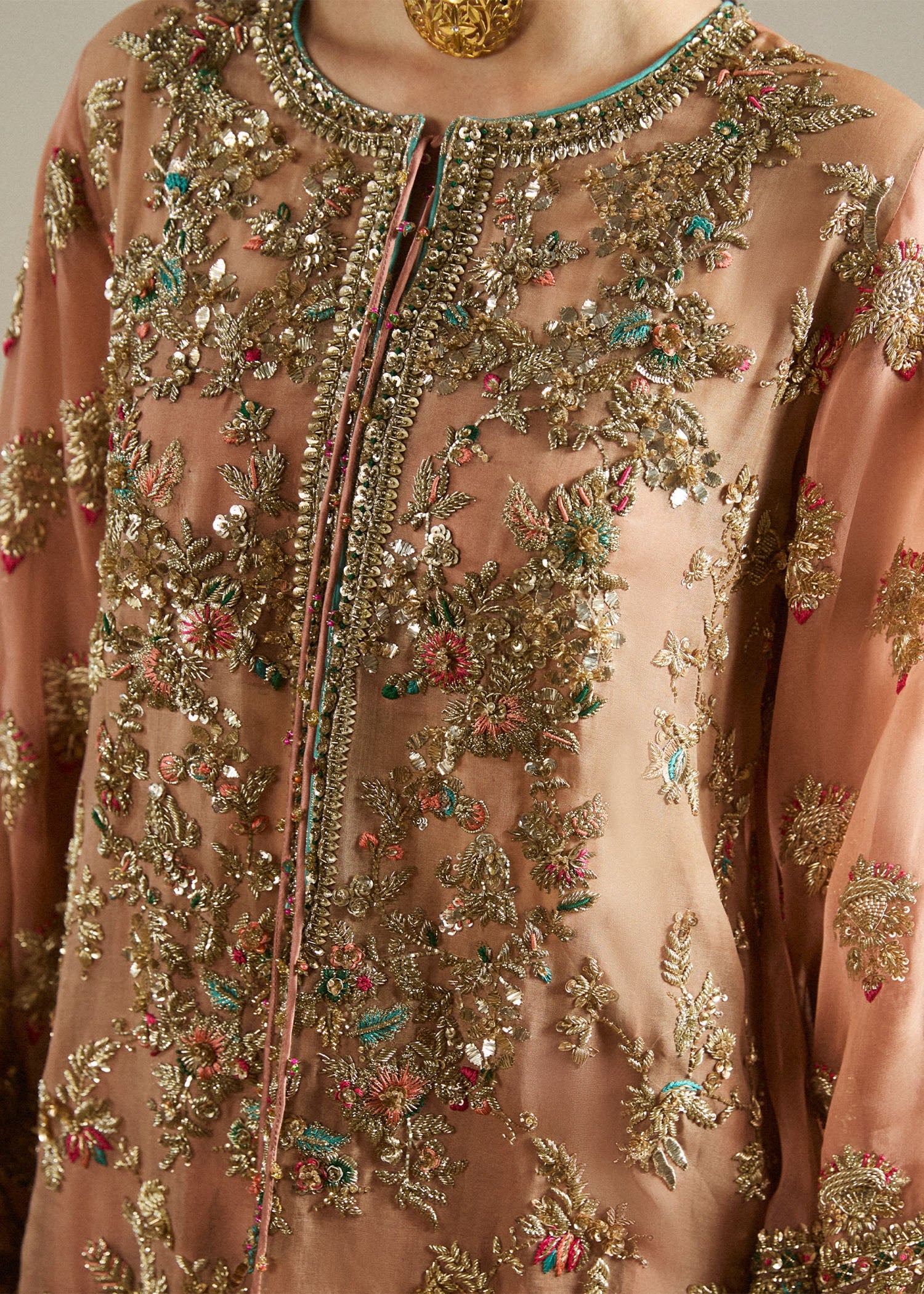 Transform your style with our stunning rose gold long organza shirt, adorned with exquisite hand embellishments and contrasting chanderi silk facings. Paired with a luxurious pure raw silk bustier, it creates a flattering silhouette. The vibrant hot pink satin silk shawl, featuring intricate hand-embellished paisley motifs, adds a captivating pop of color that draws every eye. This ensemble is a true masterpiece of elegance and artistry!