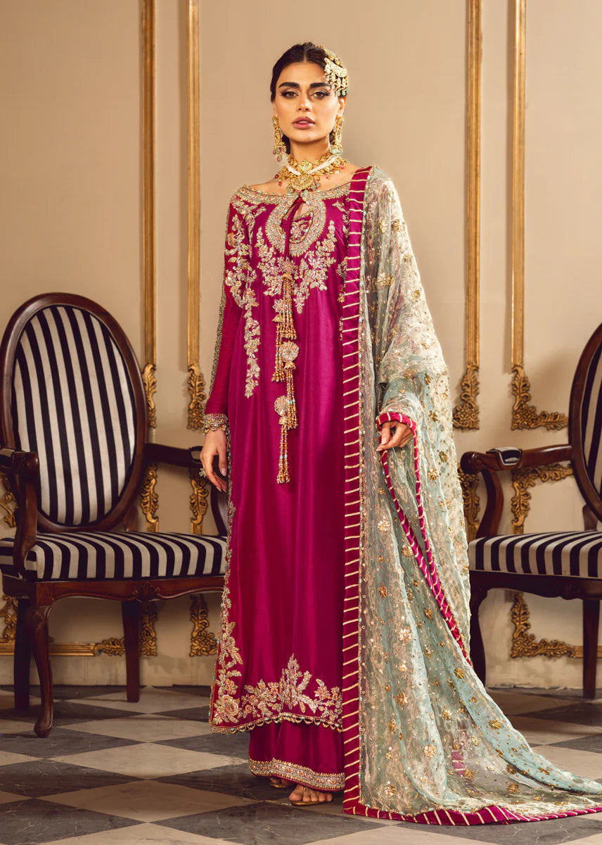 Melodic Tassels is an exquisite creation by Sara Rohale Asghar, meticulously crafted to provide a seamless blend of elegance and opulence. This luxurious set includes a hand-embellished raw silk shirt with delicate details, paired with a dyed raw silk trouser. The intricate embroidery of the dupatta and its net border add an ethereal touch to the overall look, making it a perfect choice for special occasions.