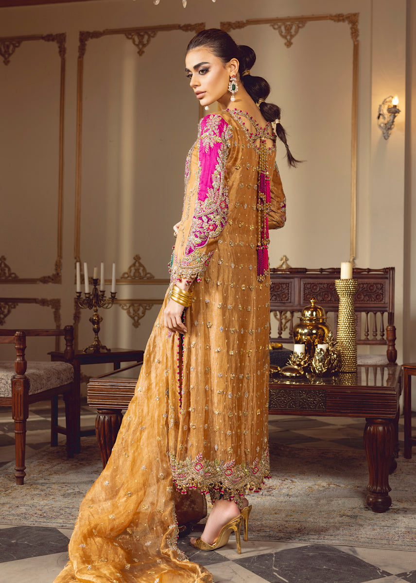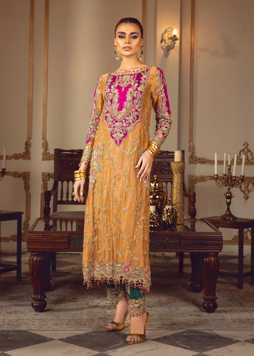 In a softly lit aura, SULTANIQUE unfolds like a mystical bloom—crafted from sheer tissue in a delicate pale tangerine, adorned with dreamy floral motifs that whisper stories of timeless traditions. Each intricate taanka graces the ornate appliqués, weaving together a vibrant symphony of hues that seamlessly merge heritage with modern sophistication. The turquoise-green raw silk pants introduce a refreshing contrast, breaking the monotone while infusing the look with festivity, vibrance, and joyous elegance.